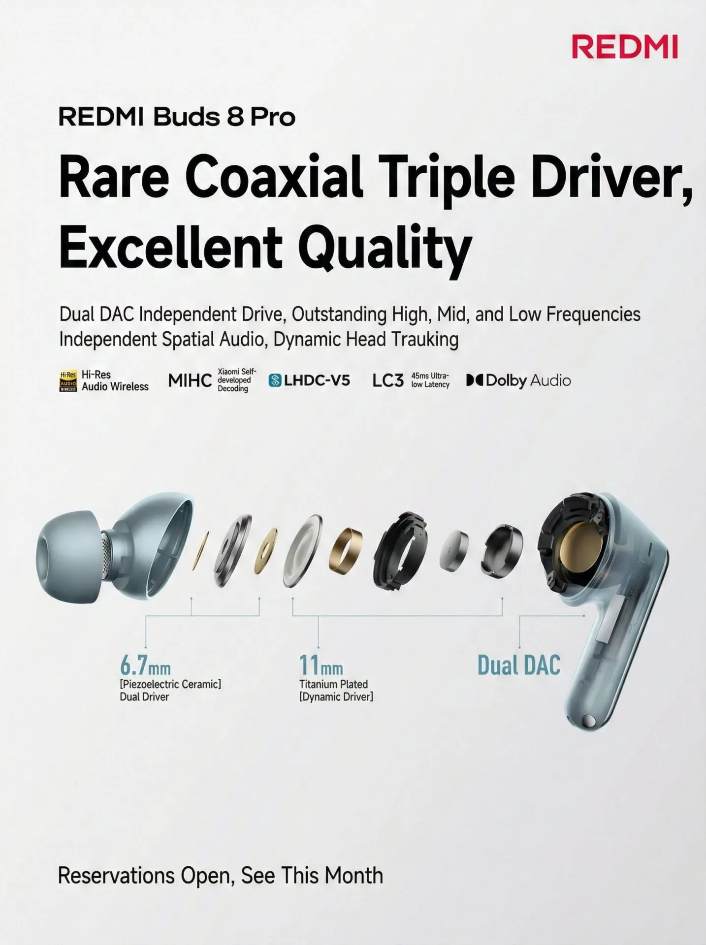 Το στοιχείο που καθιστά τα REDMI Buds 8 Pro μοναδικά είναι το ομοαξονικό σύστημα τριών οδηγών (Coaxial Triple Driver System). Η Xiaomi ενσωμάτωσε διπλούς κεραμικούς οδηγούς 6,7mm (piezoelectric ceramic drivers) για τις υψηλές συχνότητες και έναν δυναμικό οδηγό 11mm με επίστρωση τιτανίου για τις χαμηλές και μεσαίες.