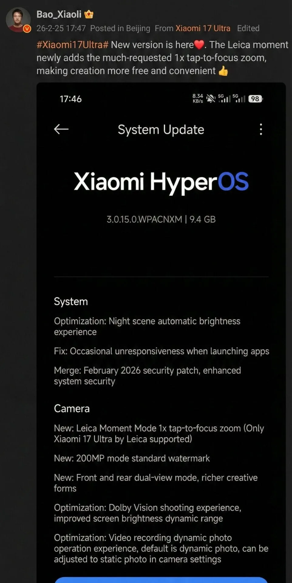 Η Xiaomi μόλις κυκλοφόρησε μια σημαντική ενημέρωση HyperOS για το flagship Xiaomi 17 Ultra. Και ναι, αξίζει την προσοχή σας. Το πακέτο HyperOS 3.0.15.0 ζυγίζει 9,4GB — αρκετά βαρύ για μια «απλή» ενημέρωση. Αλλά εδώ είναι το θέμα: δεν είναι απλή.