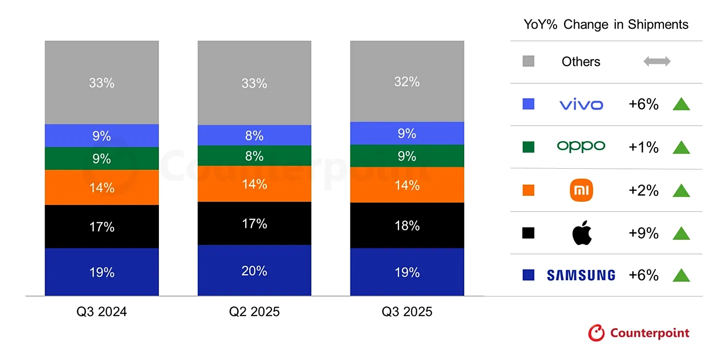 Σε παγκόσμιο επίπεδο, η Samsung συνέχισε να ηγείται με μερίδιο ~19 % και επέκταση περίπου 6 % σε σχέση με πέρυσι. Η Apple επίσης εμφάνισε αύξηση, με τη δυναμική του iPhone 17 να παίζει καθοριστικό ρόλο ιδιαίτερα σε αγορές όπως η Ιαπωνία, η Κίνα και η Δυτική Ευρώπη.